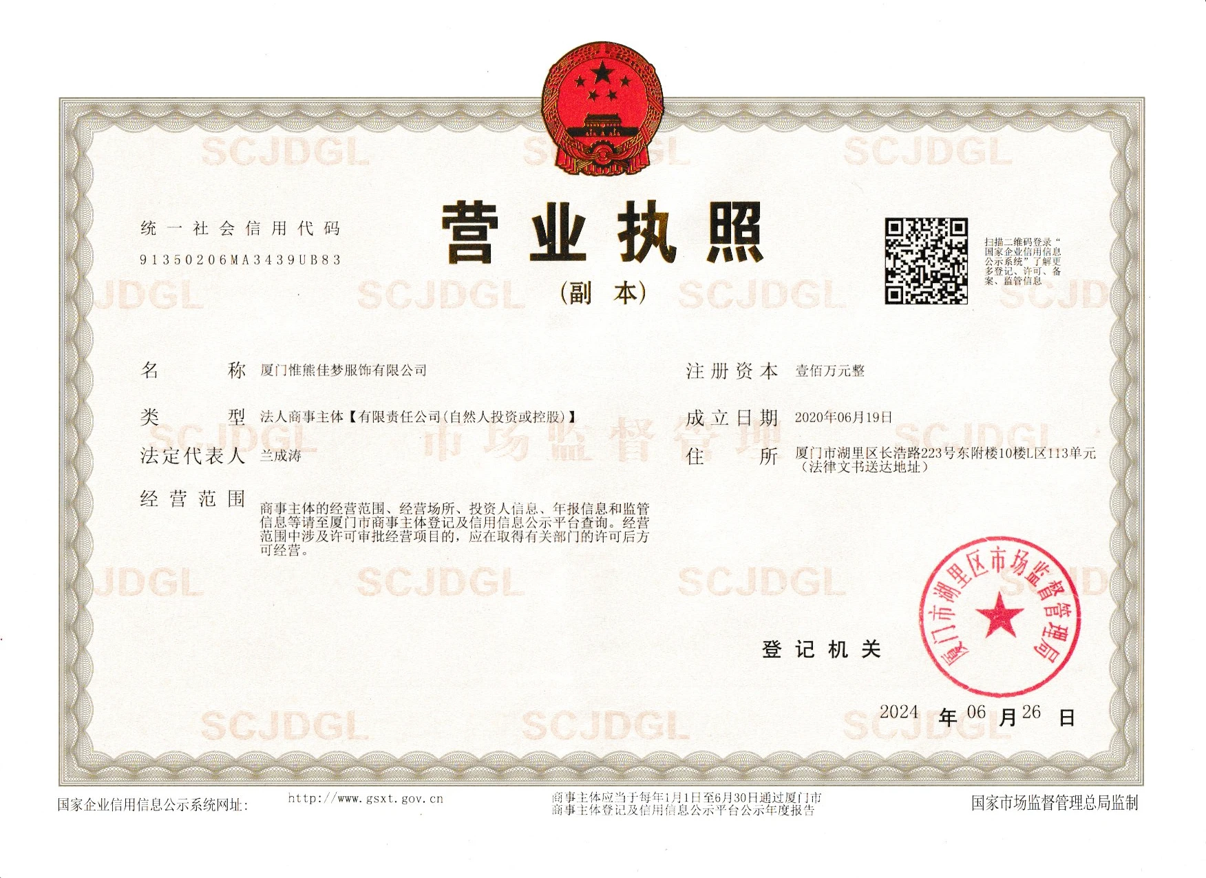 Company Name : Xiamen Weixiong Jiameng Clothing Co., Ltd.